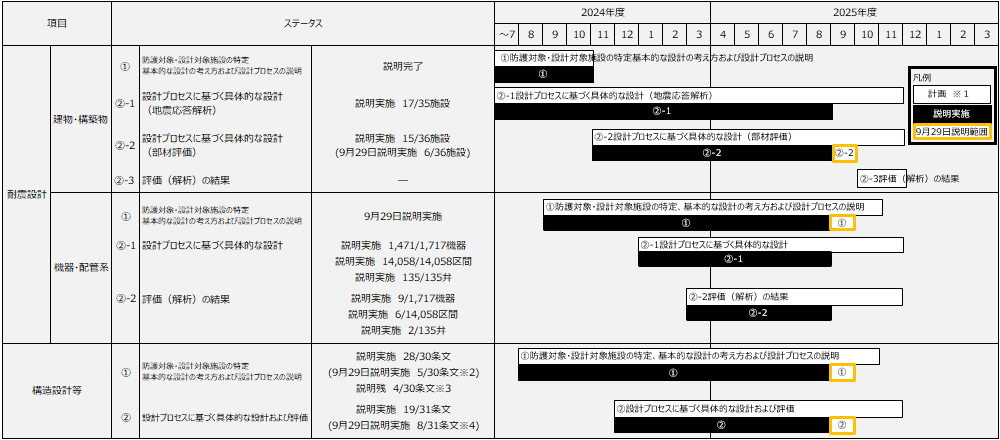 - 9月29日の審査会合において、耐震設計は、建物・構築物の設計プロセスに基づく具体的な設計(部材評価)および機器・配管系の防護対象・設計対象施設の特定、基本的な設計の考え方および設計プロセスを説明しました。構造設計等は、防護対象・設計対象施設の特定、基本的な設計の考え方および設計プロセス、具体的な設計および評価を説明しました。