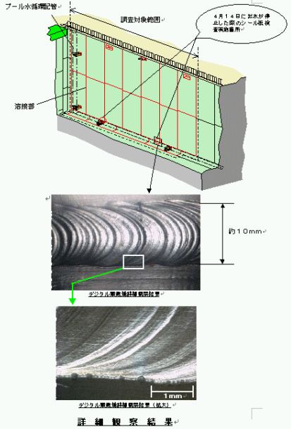 プール水排出完了後の6月23日に、プール下部の床面から順次液体浸透探傷検査を開始したところ、4月14日に出水が停止した際のシール板検査実施箇所(2箇所)のうち1箇所について、6月24日に液体浸透探傷検査により指示模様が確認されました。引続き真空箱検査を実施したところ発泡が見られなかったことから、気中でデジタル顕微鏡により詳細観察した結果、微細な穴状模様が確認されました。