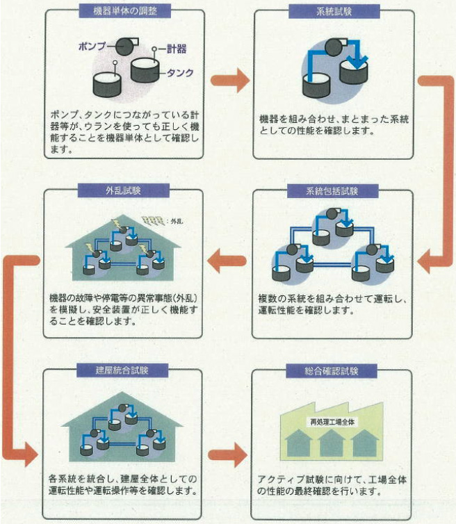 使用済燃料を使う「アクティブ試験」へ ウラン試験により機器性能等を確認したあと、使用済燃料を使う「アクティブ試験」を開始する予定です。 「アクティブ試験」により、操業と同様の状態で機器や建屋の試験を行い、その結果を分析して安全性を確認した上で、操業を開始する予定です。 |