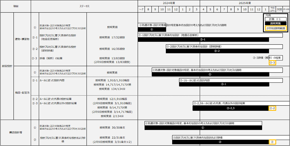 - 2月9日の審査会合において、耐震設計は、建物・構築物の評価(解析)の結果および機器・配管系のルールに従った代表の設計結果を説明しました。構造設計等は、設計プロセスに基づく具体的な設計および評価を説明しました。