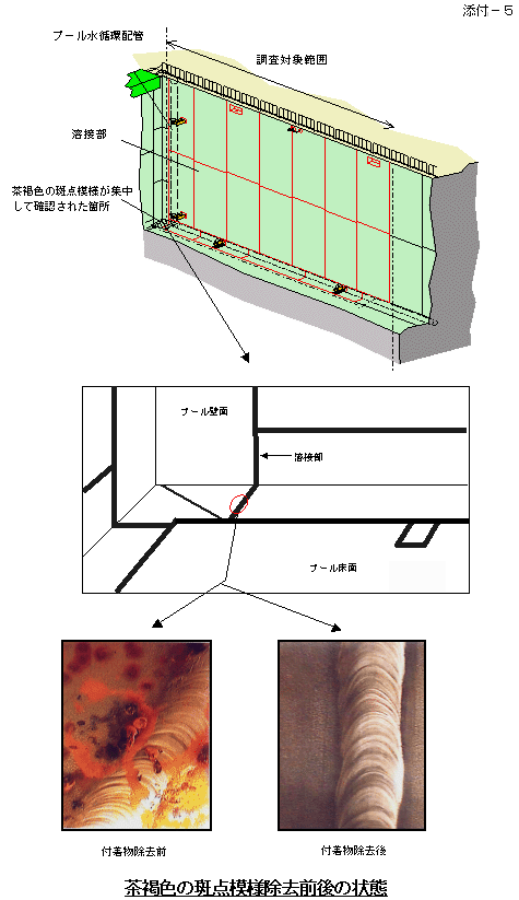 茶褐色の斑点模様の一部については、表面付着物を除去し観察した結果、母材部及び溶接部表面に付着物の痕跡や影は見られるものの、有意な欠陥は認められませんでした。